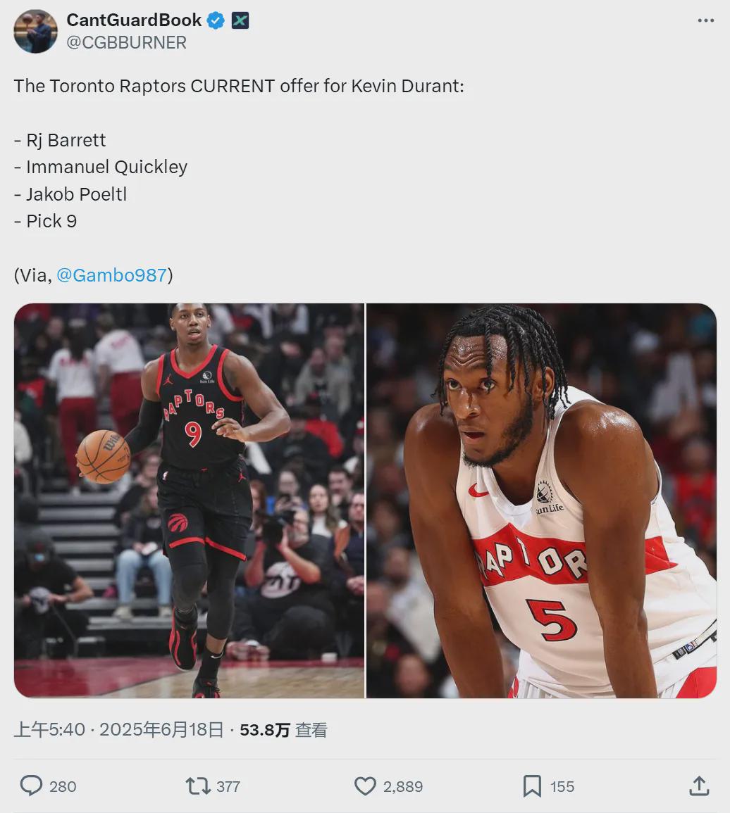 北京时间6月19日,NBA记者Matt Moore报道,快船已经退出杜兰特的交易谈判,因为快船不想把祖巴茨放进交易中。快船的态度很明确:除非能得到字母哥,否则祖巴茨就是非卖品。此外,热火也拒绝把希罗和阿德巴约放进交易!
